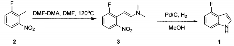 将化合物3(2.1g,10mol)置于50ml反应瓶中,加入甲醇(10ml), 室温搅拌下加入钯炭(5%,300mg),升温通氢气反应过夜。tlc监测反应完 全后终止反应,过滤,减压蒸馏除去溶剂,残余物用硅胶柱纯化得到化合物1 即4-氟吲哚(0.5g),收率:37%。