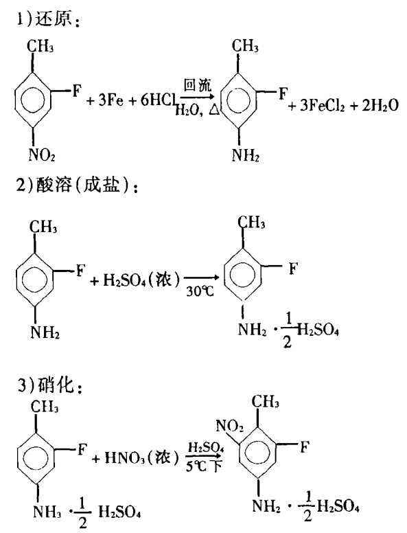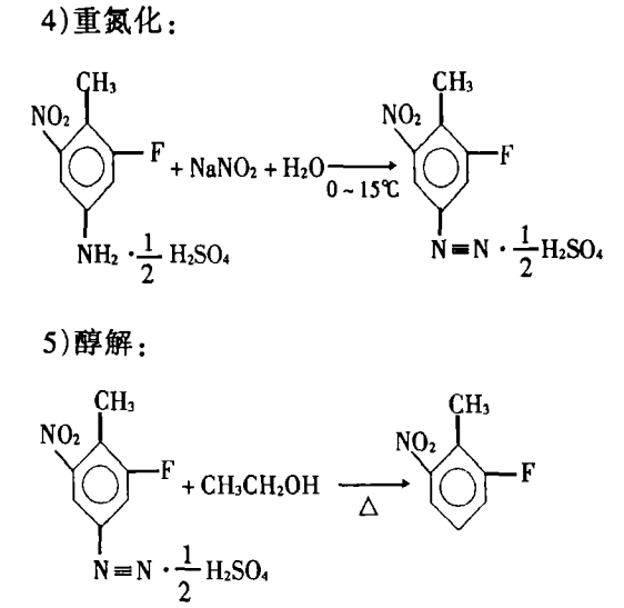 以 2-氟-4-硝基为原料,经过还原、成盐(酸溶)、硝化、重氮化、醇解、水汽蒸馏即可得含量9 8 %的 2-氟-6-硝基。反应方程式如下: