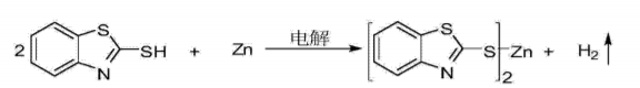在电解槽内加甲醇30ml,将纯度为98%的2-巯基并噻唑0.5g加入,再加入导电剂四丁基溴化铵0.1g,35℃水浴加热条件下充分搅拌溶解,电解槽的搅拌速度为200转/分钟,阳极为金属锌片,阴极为石墨,通直流电反应并调节反应过程中电流为60ma。tlc跟踪反应进程,电解反应至电解槽中2-巯基并噻唑消失,得悬浊液。过滤,所得滤液返回电解槽继续使用,滤饼用甲醇(5mlx3)洗涤,干燥,得固体产物2-巯基并噻唑锌盐,收率99.3%。样品x射线粉末衍射显示,晶面间距d=1.32999,0.96207,0.89702,0.73719,0.65067,0.56519nm归属为双2-巯基并噻唑锌的特征峰。