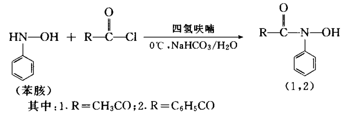 在一个500ml的三颈圆底烧瓶中加入18g胲和100ml四氢呋喃(预先冷却至0℃),以及30g碳酸氢钠和20ml水的糊状液,装上机械搅拌机、温度计和滴液漏斗,调节搅拌速度使碳酸氢钠在反应液里分散尽量均匀。反应瓶置于酒精冷阱中,使反应液温度保持在0℃。然后从滴液漏斗中滴入甲酰氯(胲与酰化试剂摩尔比为1:1.05)。加完酰化试剂后,继续搅拌20min,然后在反应液中加入100ml10%的氢氧化钠溶液及80ml石油醚,待分层后分出氢氧化钠溶液相和有机相。用50ml10%的氢氧化钠溶液洗涤2次有机相,分出氢氧化钠溶液。将上述氢氧化钠溶液合并,用二氯甲烷萃取,再用盐酸调氢氧化钠溶液的ph值到6.0,然后用二氯甲烷抽提3次,将二氯甲烷溶液浓缩至五分之一,然后加入石油醚,经冰冻,产物结晶析出。
