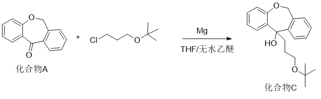 (5)将6,11-二氢二并[b,e]噁庚英-11-酮(化合物a)与3-氯丙烷基叔丁基醚(化合物b)在加入镁粉且以thf和/或无水为溶剂的条件下进行亲核加成反应,得到羟基类化合物(化合物c),反应式如下,