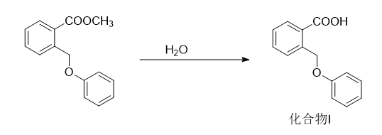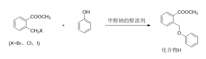(2)将邻卤甲基甲酸甲酯与酚在甲醇钠的醇溶剂中进行取代反应,得到化合物h,反应式如下,