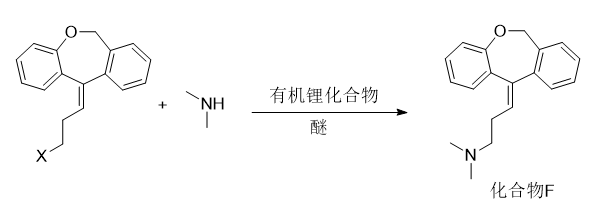 (8)将所述卤代物同二甲胺在加入有机锂化合物于醚的溶剂中下进行亲核取代反应,得到多塞平(化合物f)。