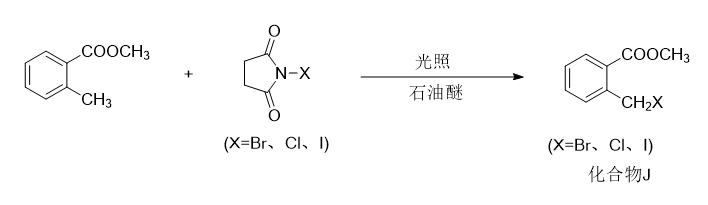 (1)将邻甲基甲酸甲酯与n-卤代丁二酰亚胺在光照条件下于石油醚溶剂中进行发生苄基卤代反应,得到邻卤甲基甲酸甲酯(化合物j),反应式如下,