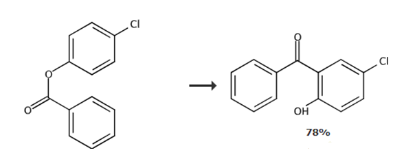 在250 ml圆底烧瓶中加入甲酸4-氯酯(23.3 g,100 mmol)和无水氯化铝(16.7 g,125 mmol,1.25eq)。将融化的反应混合物在160-180°c下缓慢搅拌3小时。将混合物冷却至室温。用冰冷的水(170 ml)和10%的盐酸水溶液(85 ml)淬灭混合物,向混合物中加入二氯甲烷(200 ml),充分摇匀直至完全溶解。将溶液转移至分液漏斗中,将水层与有机层分离,再萃取两次(2×200 ml)。将合并的有机层减压浓缩至约150 ml。将混合物转移至分液漏斗中,用2.5%氢氧化钠溶液(4×250 ml)萃取混合物。用10%的(ph≈1,约300 ml)酸化合并的碱性水层,过滤出粗沉淀,在空气中干燥滤液。用活性炭纯化后,从甲醇中结晶粗晶体,得到2-羟基-5-氯二甲酮。