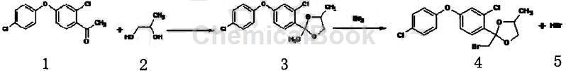 1)制备醚溴缩酮,醚甲环唑是一种新型高效杀菌剂,杀菌谱广,对子囊菌纲、担子菌纲和包括链格孢属、壳二孢属、尾孢霉属、刺盘孢属、球痤菌属、茎点霉属、柱隔孢属、壳针孢属、黑星菌属在内的半知病,白粉菌科、锈菌目及某些种传病原菌有持久的保护和治疗作用。对葡萄炭疽病、白腐病效果也很好。具体是以醚酮为原料,经过环化反应和溴化反应得到新型高效杀菌剂醚甲环唑的关键中间体醚溴缩酮。