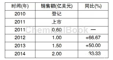 2011年上市的联吡菌胺,2014年的销售额即已达到2.00亿美元,近5年的复合年增长率接近50%。