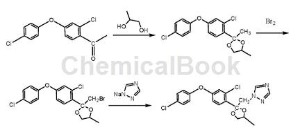 以2-氯-4-氯氧基乙酮为原料,先环化,再溴化,后与1,2,4-三唑钠亲核取代合成醚甲环唑,是早报道的合成醚甲环唑的工艺方法,目前仍是工业上合成醚甲环唑的主要方法。正如前文所论述,该法未透露关键催化剂的使用,在制备3-氯-4-甲基-2-溴甲基-1,3-二噁戊烷-2-基基-4’-氯基醚的反应过程中,有15%左右的二溴化物的生成,同时有5%左右的2-氯’-4-氯氧基乙酮不能转换,在制备醚甲环唑的反应过程中,有副产物生成,终产品质量和产率均较低。