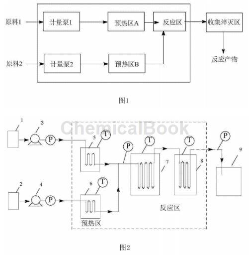 图2为本发明所使用的连续流管式反应器装置图:1、2-原料罐,3、4-原料计量泵,5-预热区,6、7-反应区,8-产物淬灭收集区。