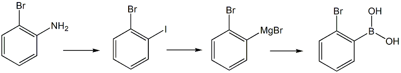 以邻溴胺为原料,经重氮化、碘代合成中间体邻溴碘,再与异丙基溴化镁进行碘镁交换合成邻溴基溴化镁,再与硼酸三甲酯进行取代反应合成邻溴硼酸甲酯,再经水解合成2-溴硼酸。