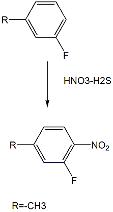 具体步骤如下:在冰浴上搅拌160cm3的浓硝酸的同时,在10℃以下滴加160cm3的浓。在5-10℃下在冰浴上搅拌的同时向该溶液中滴加90g 3-烷基氟,然后在冰浴上搅拌1小时,在室温下搅拌1小时。将反应溶液倒入500g冰中,用氯仿萃取,并用水洗涤。将残余物从水合甲醇中重结晶,得到100g 3-氟-4-硝基。