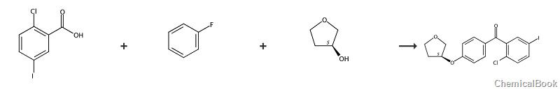 (2-氯-5-碘基)[4-[[(3s)-四氢-3-呋喃基]氧基]基]甲酮属于酮类有机物,是一种医药中间体,可用于制备具有如下通式的c-芳基葡萄糖苷sglt2抑制剂。sglt2为近端小管s1节段的上皮细胞中的主要的na+/葡萄糖协同转运蛋白,负责肾脏中90%的葡萄糖重吸收。sglt2抑制剂可抑制肾葡萄糖的重吸收,通过尿糖排泄使糖尿病患者达到具有正常血浆葡萄糖的水平,由此增加胰岛素的敏感性,并延迟糖尿病并发症的发展。