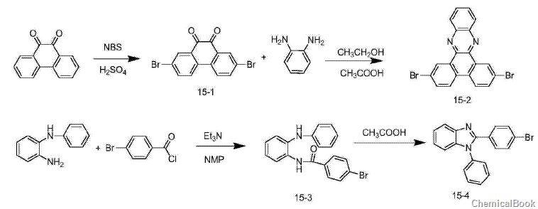 1)化合物15-1的合成:在三口烧瓶中,加入菲醌(6.24g,30mmol),浓(50ml),在0℃下缓慢加入nbs(11.2g,63mmol),反应2小时,把反应液缓慢倒入冰水中,过滤,所得固体用二甲亚砜重结晶得到5.6g橙色固体,产率为50%。