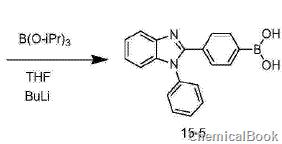 4)化合物15-5(1-基-2(3-基硼酸)-并咪唑)的合成:在氮气保护下,把化合物15-4(10.6g,29mmol)和干燥过的四氢呋喃(100ml)加入的三口烧瓶中,冷却至-78℃。随后在搅拌下用注射器缓慢注入2.5摩尔每升的n-buli正己烷溶液(20ml,50mmol),然后再加入硼酸三异丙酯(8.1g,43mmol),在这个温度下继续搅拌1小时,然后缓慢升至室温,在氮气保护下搅拌过夜。反应完,把反应液倒入到2n的稀盐酸溶液中,并用萃取三次,合并有机相,依次用盐水和水洗,再用无水钠干燥。除去溶剂,粗产物用和正己烷重结晶得到8.3g白色固体1-基-2(3-基硼酸)-并咪唑,产率为74%。