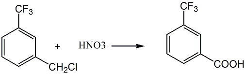 方法1:一种间三氟甲基甲酸的制备方法,是以间三氟甲基氯苄为原料,与重量百分比浓度为60~70%的硝酸在100~110℃下进行氧化反应,经冷却、过滤,得到间三氟甲基甲酸产品。