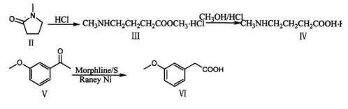 1000ml的三口瓶中加入33g升华硫,96.5ml3-甲氧基乙酮(v)和92ml吗啉,机械搅拌下回流反应15小时。降温到约30℃,机械搅拌下加入由350ml冰醋酸、105ml蒸馏水和70ml浓配置而成的混合溶液,继续回流5.5小时。反应混合物倾入冰水(400g冰+100ml水)中,机械搅拌直至黄褐色的固体析出(必要时补充碎冰),冰浴下快速冷却过滤。固体用300ml20%的氢氧化钠水溶液溶解,过滤,褐色的不溶物加入到100ml20%的氢氧化钠水溶液中加热回流半小时,趁热过滤。