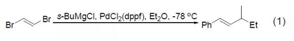 与其它的pd(ii)和ni(ii)配合物类似,pdcl2(dppf)能有效催化卤代烯烃、卤代芳烃或三氟甲基磺酸基芳烃与格氏试剂间的交叉偶联反应,实现碳-碳键的形成。乙烯基溴与s-bumgcl 在pdcl2(dppf)催化下能完全反应得到偶联产物 (式1)[1],但用其它pd催化剂则会导致异构产物和还原副产物。