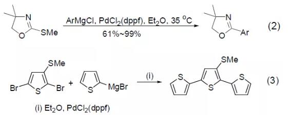 虽然普通pd 催化剂不具有活化有机硫化合物的能力,但pdcl2(dppf)能实现甲基硫化物与芳基格氏试剂间的交叉偶联反应 (式2)[2]。溴代噻吩与噻吩格氏试剂在pdcl2(dppf)催化下能得到具有光敏性的三噻吩化合物,并且底 物中的甲基硫取代基不会发生反应 (式3)[3]。【kumada偶联反应】