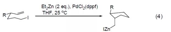 pdcl2(dppf)也被发现能催化碘-锌交换反应,得到烯烃的分子内碳锌化反应 (式4)[4]。