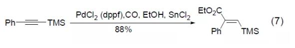 pdcl2(dppf)也能用于三甲基硅基炔的氢酯化反应,得到共轭的乙烯基硅化合物 (式7)[7]。