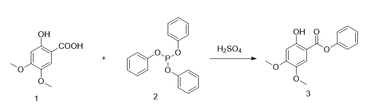 反应体系在氮气保护下,向反应器中依次加入溶剂170g,亚磷酸三酯(化合物2)266g(0.86mol),2-羟基-4,5-二甲氧基甲酸(化合物1)170g(0.86mol)和浓(98wt%)4.5ml,加热回流(110℃)3小时。反应完毕后降温至20℃,向反应体系中滴加甲醇566g,搅拌30min,然后滴加水283g,搅拌30min,过滤,水洗得粗品2-羟基-4,5-二甲氧基甲酸酯230g,所得粗品用乙醇打浆洗涤,干燥后得203g纯品2-羟基-4,5-二甲氧基甲酸酯(产率86.3%)。所得2-羟基-4,5-二甲氧基甲酸酯的产物结构中含有七组氢原子,且其化学位移与产品结构吻合,化学位移在3.78ppm处的单峰为4位och3的h峰,3.86ppm处的单峰为5位och3的h峰,6.67ppm处的单峰为3位ch的h峰,7.32ppm处的四重峰为1位甲酸酯的1’,3’和5’位ch的h峰,7.40ppm处的单峰为6位ch的h峰,7.51ppm处的三重峰为1位甲酸酯的2’和4’位ch的h峰,10.30ppm处的单峰为2位oh的h峰。