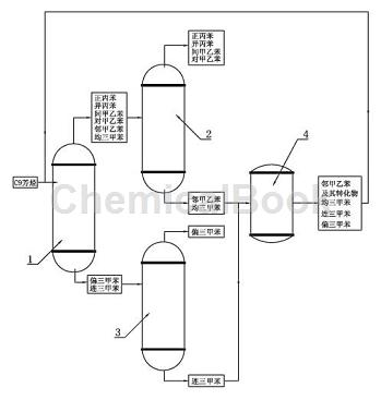 现有偏三的生产,各大生产厂家主要通过精馏法制得,通过沸点的差异实现分离。其不足之处在于:由于c9芳烃中还含有大量的其他组分,尽管从产业链上看,精馏后的副产物仍可再利用,但是作为生产偏三的厂家而言,未必都有齐全的与副产品相应的下游产品的生产设备,因此,精馏后的剩余产物中,有些只能低价销售给其他厂家。导致生产厂家的生产成本较高。如何更合理地利用c9芳烃,使其能更多地产出偏三,是偏三生产厂家亟待解决的问题。