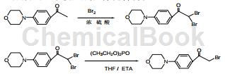 将4-吗啉基乙酮30g(0.15mol),浓210ml(约7~8倍质量体积比),加入到装有机械搅拌和温度计的500ml三颈瓶中,搅拌使之溶解。将反应液冷却至0℃,于此温度下缓慢滴入溴素7.8ml,控制温度在0℃。滴毕,室温反应。反应约6h,用tlc监测反应是否完全。将反应液倒入大量的冰水中,有黄绿色固体析出,搅拌。待冰溶解后,抽滤,水洗至中性。收集滤饼,并干燥,得黄绿色固体47g,收率88%。