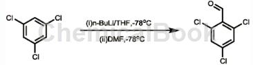具体步骤如下:在氩气保护及零下78摄氏度条件下,向250ml单口烧瓶中加入10.0g(55.1mmol)1,3,5-三氯和100ml超干四氢呋喃。然后逐滴加入23ml(2.4m,55.2mmol)正丁基锂的正己烷溶液,在零下78摄氏度条件下搅拌30分钟。然后逐滴加入7.44ml(107.3mmol)超干dmf,在零下78摄氏度条件下继续搅拌1.5小时。然后将反应体系缓慢升至室温,加入200ml(3m)盐酸溶液淬灭反应,并用萃取三次,每次25ml。合并有机层,用25ml碳酸氢钠溶液洗涤,并用无水钠干燥。将溶剂蒸干后,用二氯甲烷:石油醚=1:3(体积比)作为洗脱剂,通过柱层析提纯,得到11.0g产物2,4,6-三氯甲醛,产率95%。