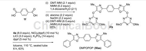 条件b:在n2中向螺旋盖管中加入5-(三嗪基氧基)恶唑3aa(100mg,0.318mmol),4-乙氧基羰基硼酸(4b,246mg,1.27mmol),nicl2(dppf)(10.9mg,0.0159mmol),k3po4(473mg,2.23),licl(40.4mg,0.954mmol),dppf(8.8mg,0.0159mmol)和(2.3ml)。混合物后在110℃下搅拌6小时,将反应混合物冷却至室温。稀释反应混合物,将ch2cl2(10ml)过滤通过短硅藻土垫,并将滤液减压浓缩。该通过快速柱色谱法(etoac:己烷=10:90)纯化残余物,得到1,4-二[2-(4-甲基-5-基恶唑)]5aab(62.5mg,64%),为白色固体。
