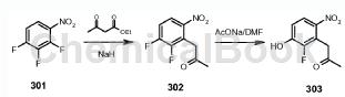 302(4.30g,0.02mol),acona(1.72g,0.021mol)和dmf(40ml)的混合物在100℃下搅拌12小时。然后过滤混合物,减压除去溶剂,残余物用(100ml)萃取。将有机层用水,盐水洗涤,经mgso4干燥并浓缩。残留物通过硅胶柱色谱纯化(etoac/石油醚=1/1),得到化合物1-(2-氟-3-羟基-6-硝基基)丙-2-酮303(2.3g,54%),为浅黄色固体:lcms:214[m+1]+;1hnmr(dmso-j6):δ2.30(s,3h),4.26(s,2h),7.67(m,1h),8.05(m,1h)。