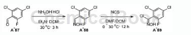 1)将2,4-二氯-6-氟甲醛(1eq),盐酸羟胺(1.3-2当量)和三乙胺(2eq。)在二氯甲烷(1.2-2.5ml/mmol醛)中的混合物在室温下搅拌16小时。完成后,将反应混合物用水稀释并用二氯甲烷(3×20ml)萃取。将合并的有机层用水和盐水洗涤,用无水钠干燥并真空浓缩,得到肟中间体。该中间体通过硅胶色谱法纯化或在下一步骤中使用而无需进一步纯化。