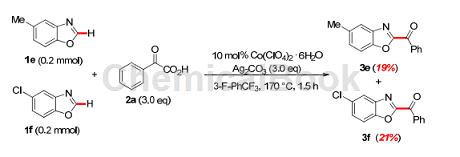 具体步骤如下:向35ml烘箱干燥的压力管中加入6-氯并噁唑(0.2mmol),α-氧代羧酸2(0.6mmol),co(clo4)2·6h2o(7.3mg,0.02mmol),ag2co3(165.4mg,0.6mmol)。)和3-f-phcf3(2.0ml)。然后将管密封并在170℃剧烈搅拌24小时。冷却至室温后,将反应混合物用dcm(20ml)稀释,通过硅藻土垫过滤,然后将滤液真空浓缩。通过硅胶快速色谱法(1%的石油醚溶液,v/v)纯化残余物,得到所需产物(3e)以及(3f)。