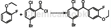 具体步骤如下:将5-溴-2-氯-甲酰氯(12.4g,48.8mmol)溶解于100ml二氯甲烷中,加入1-乙氧基-2-氟-(6.84g,48.8mmol),冷至0℃,分批加入三氯化铝(5.86g,44mmol),反应16小时。冰浴下向反应液中滴加20ml2m的盐酸溶液,分液,水相用30ml二氯甲烷萃取,合并有机相,无水镁干燥,过滤,减压浓缩滤液,得到标题产物(5-溴-2-氯-基)-(4-乙氧基-3-氟-基)甲酮(12.8g,黄色固体)。msm/z(esi):358.9[m+1]。