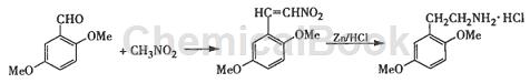 2,5-二甲氧基乙胺是合成5-羟基色胺(5-ht)类化合物的主要原料,其主要的合成方法由2,5-二甲氧基甲醛与硝基甲烷反应制备2,5-二甲氧基-β-硝基乙烯,经还原制备。2,5-二甲氧基乙烯衍生物可以作为在癌症治疗中的酪氨酸激活酶抑制剂。目前2,5-二甲氧基-β-硝基乙烯(ⅱ)的合成。采用、乙醇作为溶剂,甲胺、哌啶作催化剂的方法,使用硝基甲烷即作反应物又作溶剂,使用醋酸铵作催化剂,缩短了反应时间,收率也有所提高。