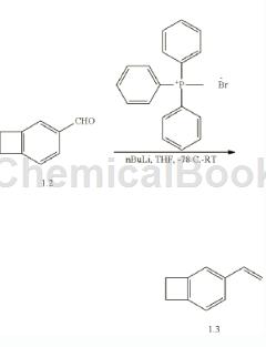 可用于制备4-乙烯基并环丁烯。向500ml圆底烧瓶中加入甲基三基溴化鏻1.1(48.6g,136.2mmol),220ml无水thf,并将溶液冷却至-78℃,逐滴加入n-buli(2.5m己烷溶液,52.8ml,132mmol),并将反应混合物温热至室温。将黄橙色溶液冷却至-78℃,缓慢加入稀释于无水thf(70ml)中的醛1.2(14.32g,108.4mmol)。将混合物温热至室温并继续搅拌2小时。依次用饱和nh4cl和饱和nahco3溶液处理反应,粗产物用硅藻土过滤,用/己烷(1:1)洗涤,蒸发至干(不加热),得到粗产物。通过柱色谱进一步纯化,使用5%/己烷作为洗脱溶剂,然后真空蒸馏(75℃,1.0mm),得到纯的4-乙烯基并环丁烯1.3,为无色液体(11g,78%)。 1h nmr(300mhz,cdcl3):δ7.26(d,1h),7.20(s,1h),7.04(d,1h),6.74(dd,1h),5.70(d,1h),5.20(d, 1h),3.19(s,4h)。