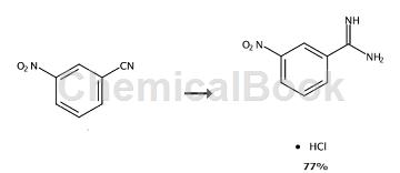 称取3-硝基腈74g(0.5mol)于250ml圆底烧瓶中,加入200ml甲醇使之溶解,加入质量百分比为50%的甲醇钠的甲醇溶液5.6g(0.052mol),室温下磁力搅拌反应4h。向上述体系中投入氯化铵27.5g(0.515mol)后,室温继续反应48h。tlc跟踪反应终点,反应结束后蒸干溶剂,剩余固体用洗涤,过滤,重复三次,滤饼依次用热水(约60℃),乙醇重结晶,即得到橙色针状晶体3-硝基脒盐酸盐78g。产率77.4%。