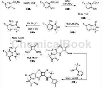 cn108697684 报道了2-氰基-5-氟甲酸可用于制备化合物(r)-3-((7-氯-5-氟-1,1-二甲基-3-氧代异吲哚啉-4-基)氨基)-4-((2,2-二甲基-1-(5-甲基呋喃-2-基)丙基)氨基)环丁-3-烯-1,2-二酮。如下图所示: