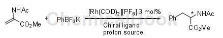 不对称合成泛指利用特殊的化学试剂、溶剂、催化剂或物理因素等将潜手性单元转化成手性单元,从而产生不等量的立体异构产物的一类反应。不对称合成反应在近年来发展十分迅速,成果显著,成为有机化学中研究活跃的领域之一,利用这一方法合成丙氨酸的报道也有许多。1988年报道了以d-樟脑与甘氨酸持丁醋缩合的d-樟脑酮亚胺为手性合成子,通过不对称合成的方法,对映选择合成了d-丙氨酸,产物光学纯度和ee值达95%,产率达到92.7%。但是此法反应条件要求较苛刻,能耗高,成本较高,只适合实验室小量合成研究。另一种有效的不对称合成α-氨基酸的方法是利用铑催化串联的1,4-加成质子化(michael型的加成反应)催化α,β-脱氢氨基酸。利用有机金属试剂在铑催化剂和手性膦配体存在条件下对酰氨基丙烯酸酯进行反应,得到相应的α-手性氨基酸衍生物。丙氨酸衍生物的ee值为89.5%且为l构型。该方法操作简单,但是反应使用过多的铑催化剂和手性膦配体,成本过高且产物光学纯度不高,还只停留在实验室研究阶段,未见生产报道使用该法。