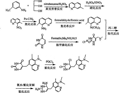 5. 制备一种新型磺胺增效剂2,4-二氨基-5-(8-二甲氨基-7-甲基-5-喹啉基甲基)-2,4-(1h,3h)嘧啶。以尿嘧啶、3-甲基胺,丙三醇和间硝基为原料,依次经过胺甲基化反应、斯克劳普反应、硝化反应、氢化还原反应、胺甲基化反应、取代反应、氯化反应和氨化反应,终合成2,4-二氨基-5-(8-二甲氨基-7-甲基-5-喹啉基甲基)-2,4-(1h,3h)嘧啶。该方法优点:所用原料易得、价格低廉,反应条件相对温和且工艺简单,易于控制,所需设备简单,反应总收率较高,为20.3%,易于工业化生产。