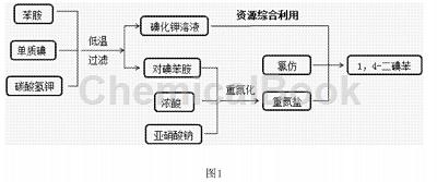 cn201610129881.6提供了一种低成本且绿色环保的1, 4-二碘的制备方法,该方法原料易得,产率高,适应于工业化规模生产。如图1工艺流程,将9.3g胺(0.1mol)加入到110毫升10%(w/w)的碳酸氢钾溶液中,然后15~20分钟内分批加入已碾碎的碘与胺摩尔比1.05:1的26.7g单质碘,5~10℃ 下进行亲电取代反应4小时,反应完成后过滤。液体是反应生成的碘化钾溶液,直接用于的碘置换反应。固体干燥后得对碘胺21.0g,产率95.8%。