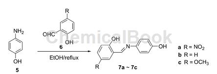 对光致变色和热致变色席夫碱衍生物晶体结构的研究表明,晶格中席夫碱分子的堆积情况有很大的不同,而且 π-π 堆积对质子转移有抑制作用。合成方法如下:将 2-羟基-5-硝基甲醛(70 mg,0.44 mmol)或水杨醛(55 mg,0.44 mmol)或 2-羟基-5-甲氧基甲醛(66.9 mg,0.44 mmol)加入到含0.22 mmol 化合物 3 的乙醇(15 ml)溶液中,加热回流 8h。冷去后析出固体,粗产物经乙醇重结晶提纯。