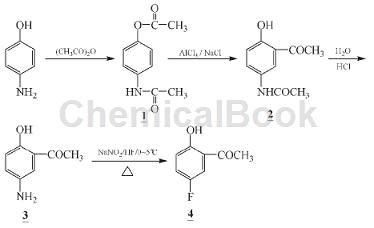 1. 以对氨基酚为原料,一步进行氨基与酚羟基的双重酯化,三氯化铝/氯化钠条件下进行fries 重排,水解产物进行氟重氮化后加热得5-氟-2-羟基乙酮成品