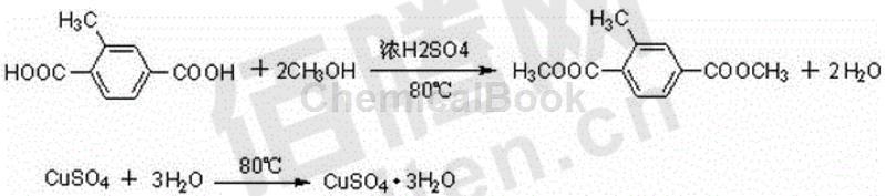 2-甲基-1,4-二甲酸可用作医药化工合成中间体。如合成2-甲基对二甲酸二甲酯。2-甲基对二甲酸二甲酯作为合成乙烯基对二甲酸类甲壳型液晶高分子过程中的一种重要化合物,目前大多数采用酸催化合成,产率比较底,只有33%左右,对原材料的损耗比较大。由于2-甲基对二甲酸二甲酯作为合成乙烯基对二甲酸类甲壳型液晶高分子一种必要的中间体,因此提高其产率具有重要的意义,但大多数酸催化酯化反应存在转化率低的问题。在此反应中甲醇既作为反应试剂,又作为溶剂,甲醇的沸点低,找不到合适的带水剂来利用油水分离器除水。因此在已有的研究基础之上,加入吸水性较强的无水铜粉末,在80℃环境下,无水铜可结合3个水分子,使得酯化转换率提高。所得产物用红外ir、核磁nmr分析结果表明合成的化合物的正确性,这为下一步大批量合成乙烯基对二甲酸类甲壳型液晶高分子的研究打下基础。具体制备方法如下:以2-甲基对二甲酸为原料,依次包括下述步骤:1)酯化:在浓催化下,2-甲基对二甲酸和甲醇,在80℃下发生酯化反应,反应时间为8h~12h,2-甲基对二甲酸和甲醇物料比为1:10;2)吸水:以无水铜为吸水剂,在上述混合液中加入无水铜,2-甲基对二甲酸和无水铜的重量比为20:17~1:1;3)萃取:以二氯甲烷为萃取剂,分出下层有机相;4)重结晶:将所得2-甲基对二甲酸二甲酯粗品在石油醚中重结晶,即可得2-甲基对二甲酸二甲酯。