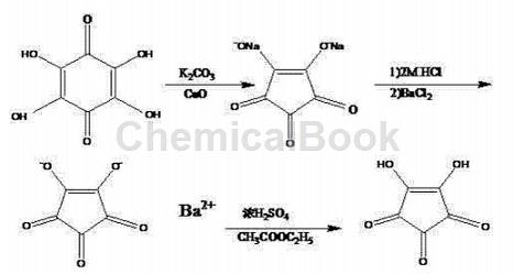 将上步得到的氧化铜催化剂与四羟基醌、无水碳酸钾按照比例混合加入三口烧瓶中,并加入去离子水,在磁力搅拌条件下加热回流40~60 min,然后冷却至室温,得到黄色液体;将上述液体进行过滤,再用热水洗涤滤饼,并将滤液与洗液合并,加入足量浓盐酸酸化;配制氯化钡饱和溶液,移取氯化钡饱和溶液于上述溶液中,然后持续续搅拌加热至90℃;冷却液体至室温,过滤得到黄色钡盐沉淀,放入烘箱内在100 ℃条件下干燥30~40 min;将干燥产品转入三口烧瓶中,加入无水甲醇,搅拌条件下加入浓,加热回流20~30 min,反应结束,冷却、静置,滤去白色钡沉淀;将得到的沉淀物用洗涤,将洗液和之前滤液合并,在旋转蒸发仪中旋蒸去除溶剂,得到黄色晶体,用丙酮洗涤后进行干燥得到克酮酸。