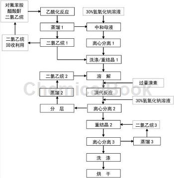 1、以对氟胺为原料经乙酰化、氯化得产品