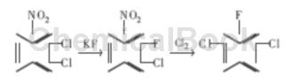 反应分二步进行,步:2,3-二氯硝基在溶剂或相转移催化剂作用下与kf 进行卤素交换氟化反应,得到2-氟-3-氯硝基;第二步:2-氟-3-氯硝基在高温下进行自由基反应,—cl 取代—no2 后得到产物2,6-二氯氟。
