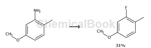 将5-甲氧基-2-甲基胺(5.0g; 36mmol),hcl(7.6ml,12m溶液; 91mmol)和h2o(11ml)的混合物在60℃下加热15分钟直至溶清。 将反应冷却至0℃并逐滴加入nano2水溶液(2.5g; 36mmol)(内部温度= 7℃)。 将反应在0℃下搅拌30分钟,并小心地加入0℃的hbf4溶液(5.3ml的48%溶液; 40mmol)。将反应在0℃下搅拌20分钟,过滤得到的棕色固体,用冰水(3×10ml)和h2o(2×10ml)洗涤。 将固体在高真空下干燥20小时,然后加热(加热枪)直至bf3(白烟)的释放停止。将得到的棕色油状物在etoac和h2o之间分配。 将有机相干燥(na2so4),真空浓缩并通过kugelrohr蒸馏得到3-氟-4-甲基甲醚(1.6g; 31%),为无色油状物。