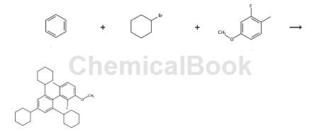在500ml三颈圆底烧瓶中,将三氯化铝(38g,285mmol)和(8ml,89mmol)在ch2cl2(60ml)中的悬浮液冷却至0℃。逐滴加入环己基溴(35ml,285mmol)。将反应物搅拌2小时,缓慢升温至室温(如果反应在室温下搅拌更长时间,则产物的产率急剧下降)。然后小心地用50ml冰淬灭反应混合物,并用200ml稀释。分离各层,醚层用50ml水和50ml盐水洗涤两次。然后将有机层用mgso 4干燥,过滤并浓缩。将得到的无色油状混合物通过二氧化硅塞过滤,得到1,3,5-三环己基,gc表明纯度为80%,并将其原样用于下一步骤。产量24g,84%。 1h nmr(400mhz,cdcl3)δ:6.87(s,3h),2.53-2.38(m,3h),1.92-1.77(m,15h),1.72(d,j = 12.4hz,4h),1.48-1.29 (m,14h),1.29-1.17(m,4h)ppm-由于杂质,积分略微偏离。 13 c nmr(101mhz,cdcl3)δ:148.0,123.13,45.0,34.5,27.2,26.5ppm。
