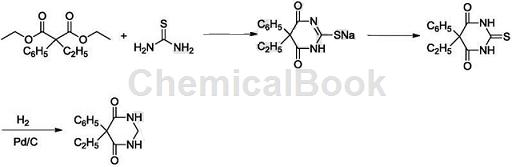 1.由基丙二酸二乙酯经乙基化而得。2.氰化苄与乙醇在存在下反应生成。所得经精馏后与草酸二乙酯及乙醇钠进行缩合反应,经盐酸酸析后再用溴乙烷进行乙基化反应,生成基乙基丙二酸二乙酯,后经减压分馏精制得成品。另一种生产方法是由与碳酸二乙酯、溴乙烷缩合。
