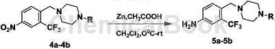 取100ml两口圆底烧瓶,依次加入4-(4-甲基哌嗪-1-亚甲基)-3-三氟甲基-1-硝基(3.30mmol),锌粉(7.11g,108.81mmol),二氯甲烷25ml。体系冷却至0℃后,将稀释于10ml二氯甲烷中的ch3cooh(1.58g,26.34mmol)用滴液漏斗缓慢滴加到体系中,滴毕,将混合物于0℃,搅拌1h后,移至室温搅拌4h,tlc检测反应进程。反应结束后,过滤锌粉,滤饼用二氯甲烷洗涤,合并有机相,用20ml×2饱和nahco3溶液洗涤,无水na2so4干燥,过滤,减压浓缩,柱层析纯化(ch2cl2:ch3oh=25:1,氨水:0.5%)得到化合物5,产率:62%-70%。